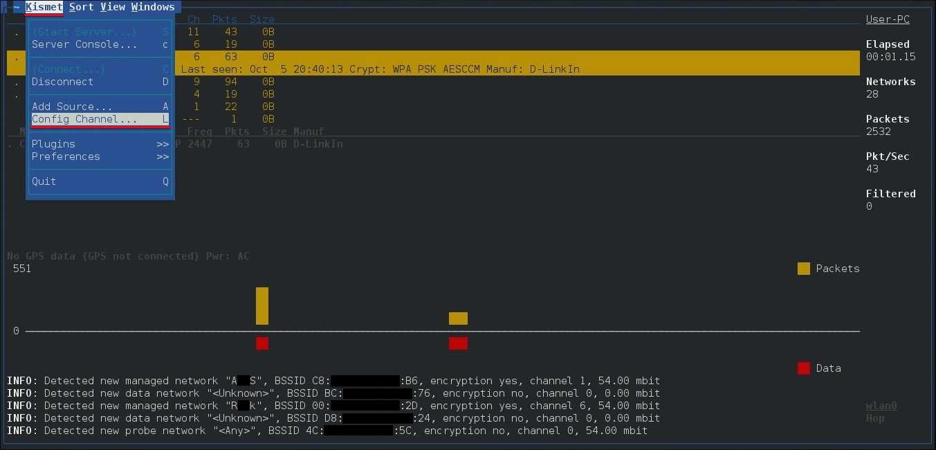 Для взлома WPA2 часто используют утилиту Kismet для Linux. После выбора нужной сети определяется канал, на котором она находится. Затем в меню Kismet -> Config Channel нужно указать в сетевой карте этот номер канала: выбрать пункт Lock в появившемся окне, задать номер в поле поле Chan/Freq и нажать Change.