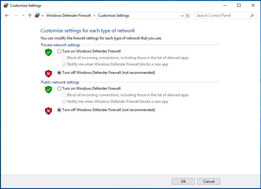 Шаг 2: нажмите Включение или отключение брандмауэра Защитника Windows и проверьте Отключить брандмауэр Защитника Windows (не рекомендуется) и нажмите Хорошо .