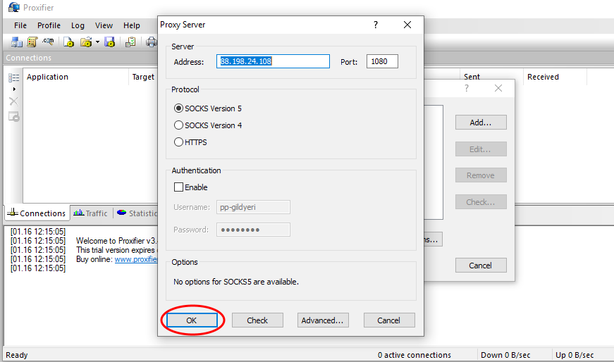С этого момента все новые соединения (TCP / IP) будут устанавливаться через указанный мобильный прокси-сервер во время работы Proxifier.