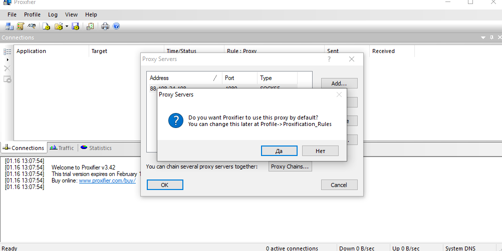 Proxifier спросит вас, хотите ли вы использовать этот прокси по умолчанию. Щелкните Да, чтобы установить его в качестве цели для правила проксификации по умолчанию. Вы можете изменить это в любое время позже в Правилах проксификации.