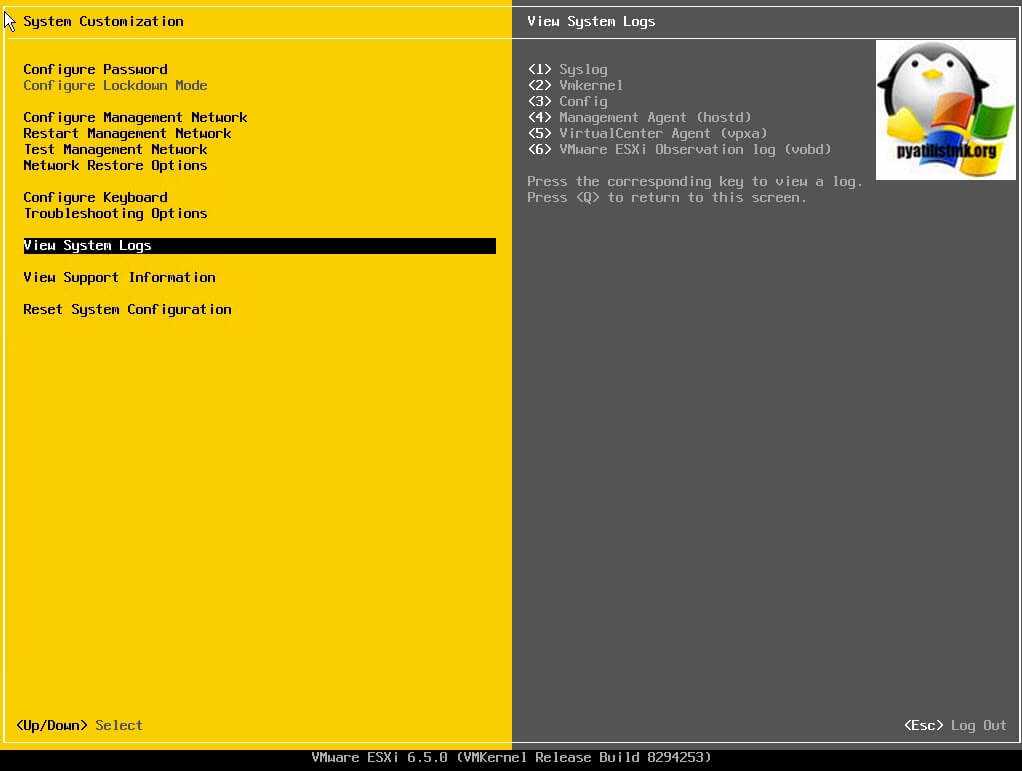 Логинимся на сервер через DCUI интерфейс и находим пункт меню «View System Logs». У вас будут шесть пунктов: