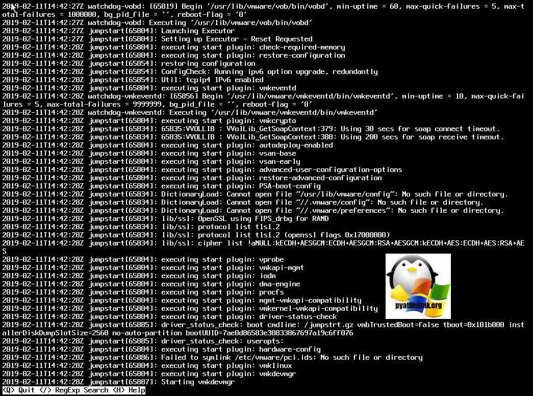 Для примера я выберу цифру 1 и посмотрю системные логи. Перед вами будет окно с логами ESXI, для перемещения вы можете использовать стрелки вниз или вверх, если нужно быстрее, то клавиши Page Up или Page Down.