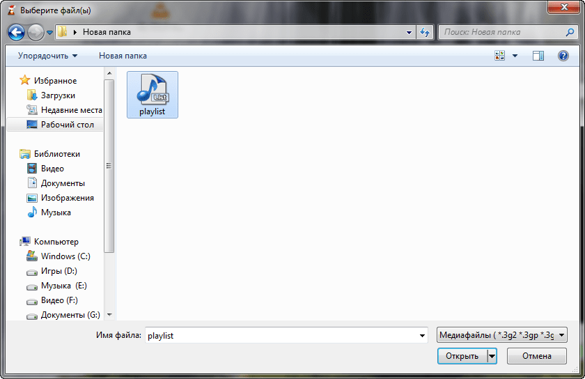 Далее все проходит как при открытии обычного файла мультимедиа. Мы находим на нашем компьютере папку, в которую мы сохранили плейлист и открываем ее. Там находиться файл playlist.m3u. выбираем его и нажимаем открыть.