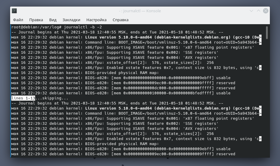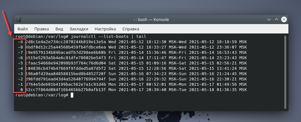 Видите столбец, который я обвел красным? Цифрой в нем обозначена текущая загрузка системы, цифрой — предыдущая и т.д. Если вы хотите просмотреть логи какой-то конкретной загрузки, например, позапрошлой, то достаточно ввести: