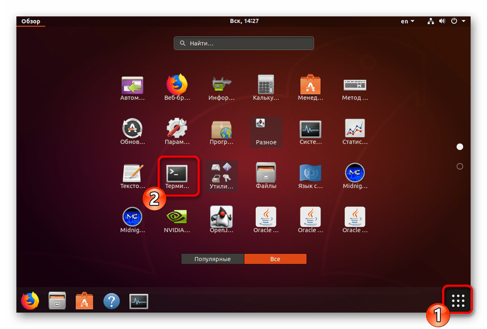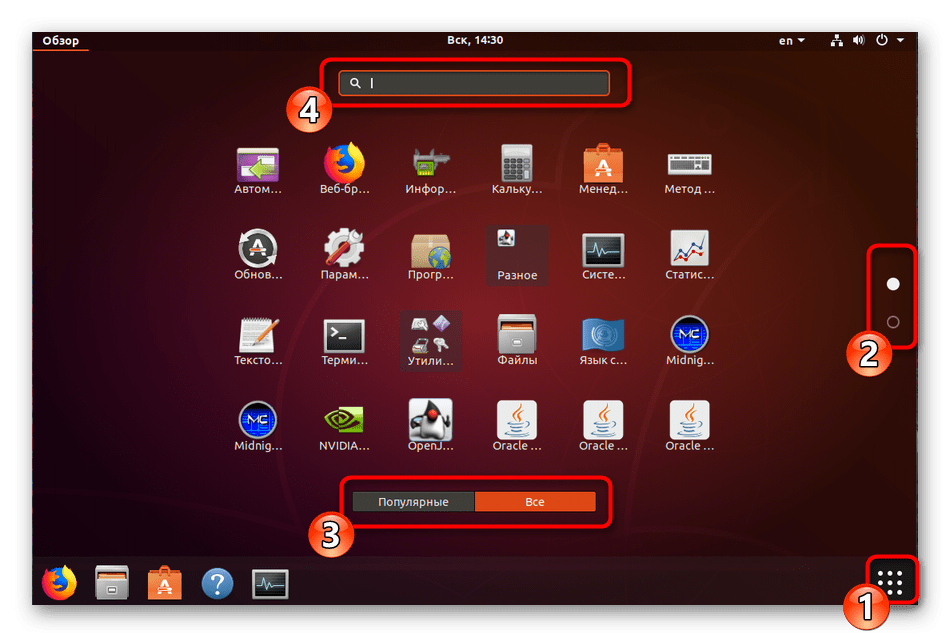 Конечно, графический интерфейс в Ubuntu не позволяет в полной мере проводить те же операции, которые доступны в консоли, однако визуализация кнопок и утилит значительно упрощает выполнение задачи особенно для неопытных юзеров. Сначала советуем обратиться в меню. Здесь присутствует несколько вкладок, а также сортировка на показ всех программ или только популярных. Поиск требуемого пакета может производиться через соответствующую строку.