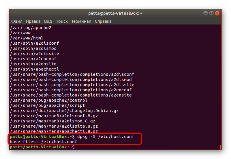 Если вы хотите узнать, каким пакетом был добавлен определенный файл, следует ввести , где /etc/host.conf — сам файл.