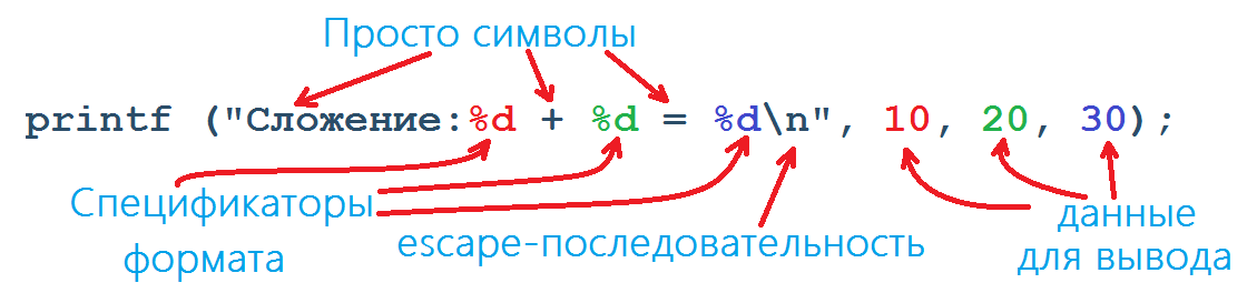 На следующей картинке показан принцип работы функции printf.
