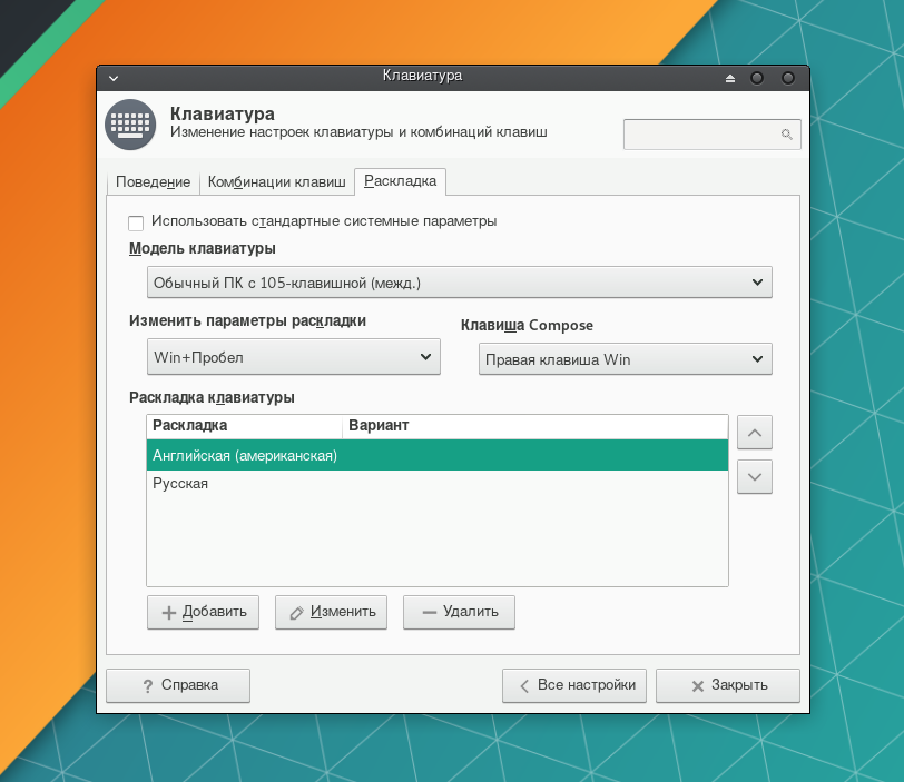 В выпадающем списке поля Изменить параметры раскладки укажите метод переключения между раскладками. При желании укажите клавишу для поля Compose, с помощью которой можно добавлять символы, отсутствующие на клавиатуре (аналог работы Alt + цифры в Windows).