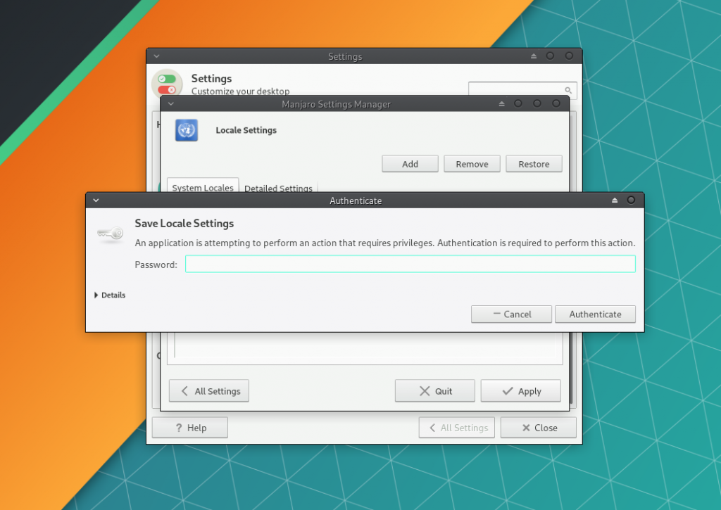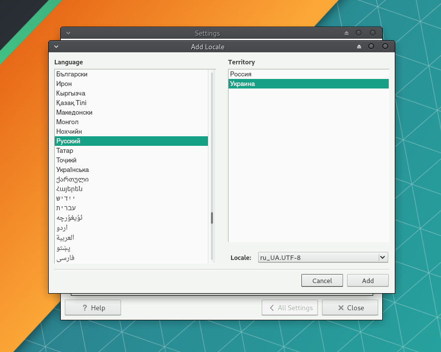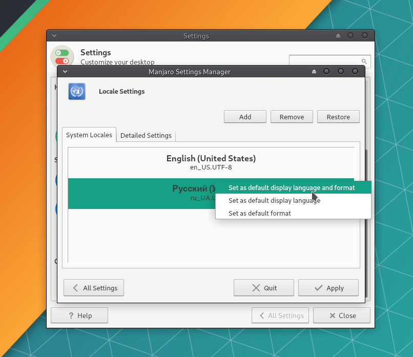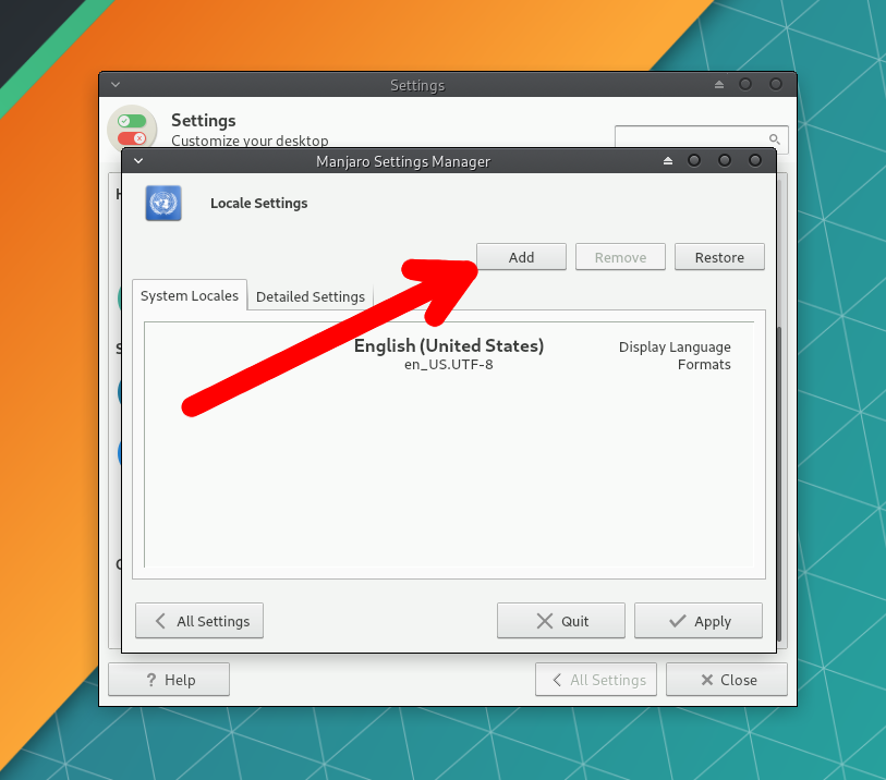 Перейдите в Manjaro Settings Manager →Locale Settings и нажмите Add, чтобы выбрать язык системы.