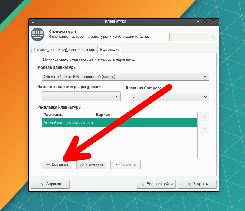 7. В открывшемся окне выберите «Раскладки клавиатуры» и нажмите «Add»: