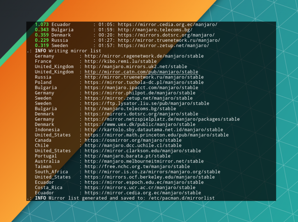 После показа выбранных серверов утилита запишет их в файл /etc/pacman.d/mirrorlist, оповестив об этом в конце процедуры.