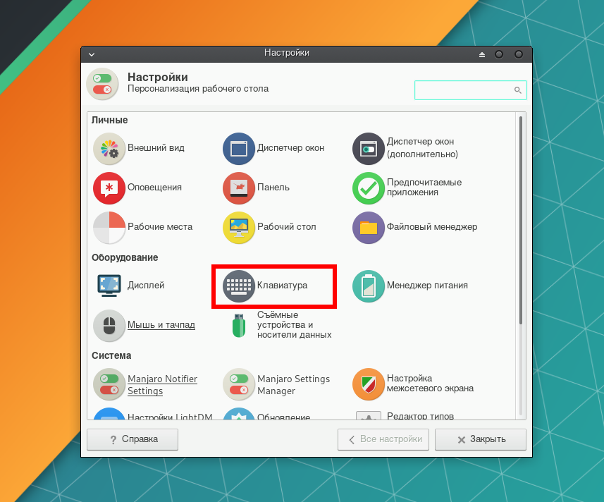По умолчанию установлена только та языковая раскладка клавиатуры, которая использовалась при инсталляции системы. В нашем случае, это английская. Для добавления русской раскладки перейдите в Диспетчер настроек → Клавиатура.