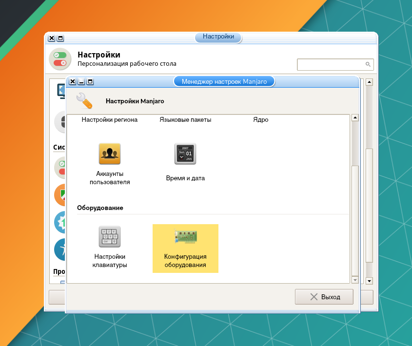 При наличии дискретной видеокарты необходимо установить её драйвер. Для этого войдите в Диспетчер настроек → Manjaro Settings Manager и выберите Конфигурация оборудования.