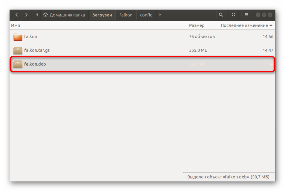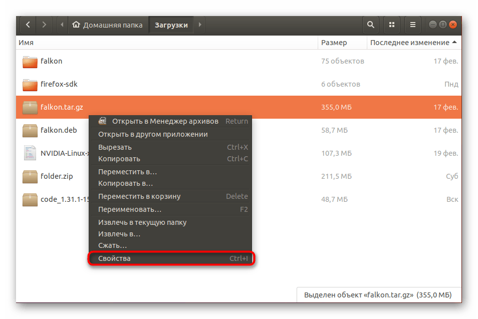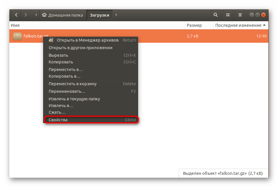 - Для начала необходимо определить место хранения нужного архива, чтобы в дальнейшем перейти в родительскую папку через консоль и уже там осуществлять все остальные действия. Поэтому откройте файловый менеджер, найдите архив, щелкните по нему правой кнопкой мыши и выберите «Свойства».