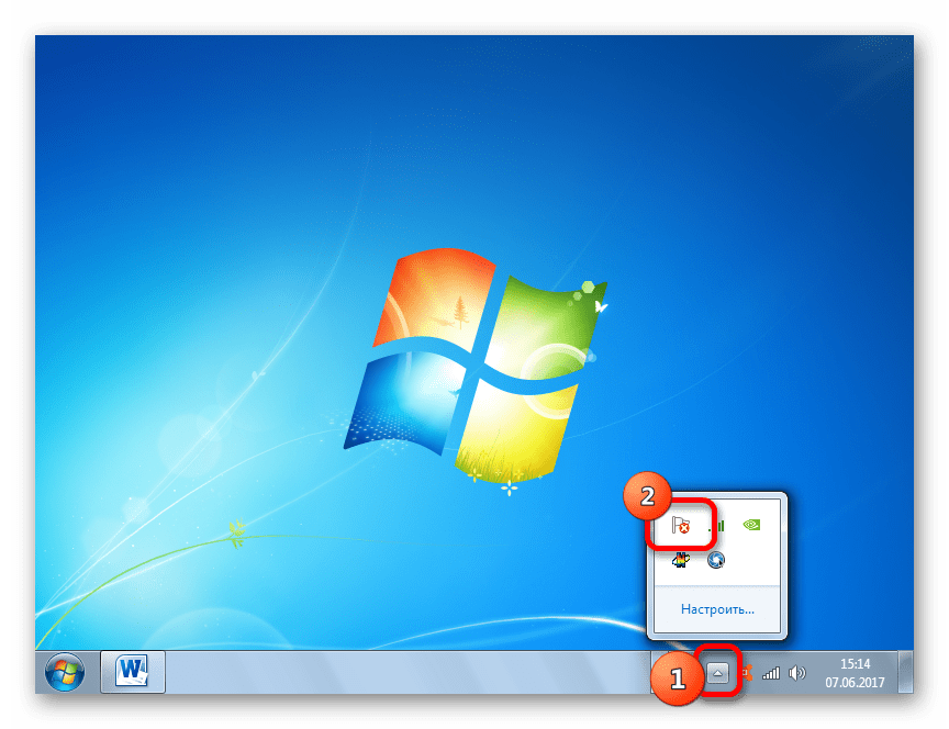 - В системном трее щелкаем по треугольной иконке «Отображать скрытые значки». Из открывшегося перечня выбираем значок в виде флажка – «Устранение проблем ПК».