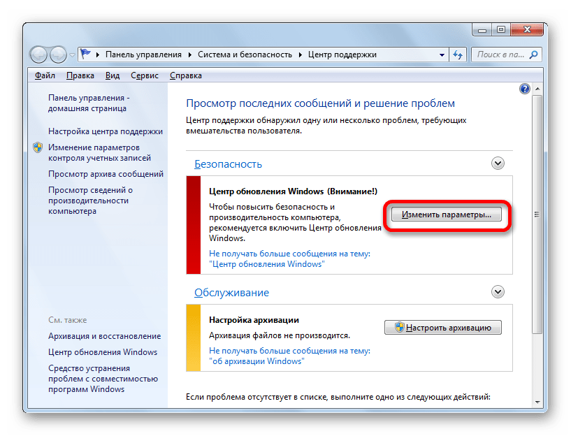Запускается окно Центра поддержки. Если у вас отключена служба обновления, то в разделе «Безопасность» будет отображаться надпись «Центр обновления Windows (Внимание!)». Кликаем по находящейся в том же блоке по кнопке «Изменить параметры…».