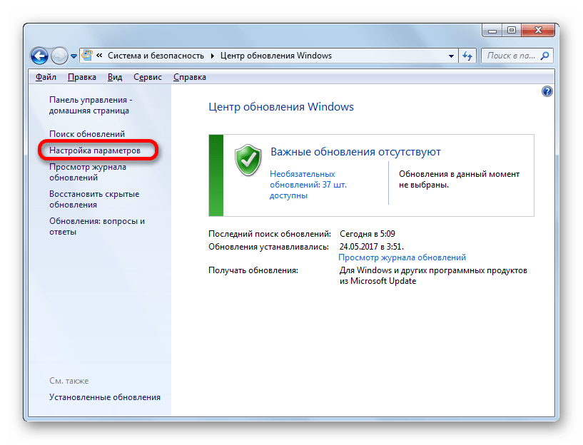 После этого открывается сразу Центр обновления Windows. Переходим в нем в раздел «Настройка параметров» и все дальнейшие действия по включению автообновления выполняем точно так же, как и при переходе через Панель управления, описанном выше.