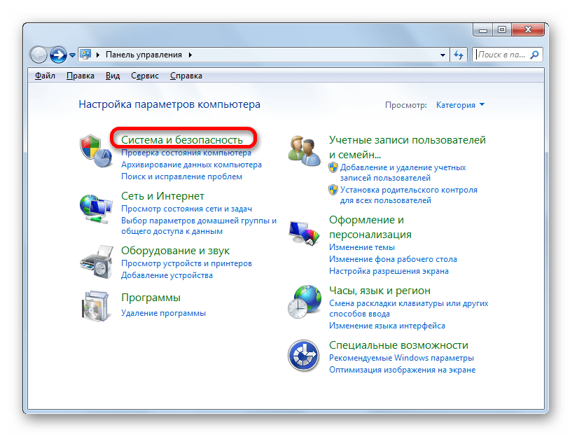 В открывшемся окне Панели управления переходим в самый первый раздел – «Система и безопасность».