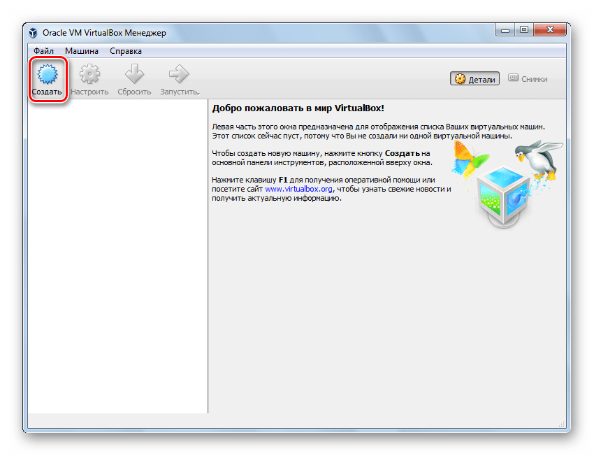 - Для начала запустите VirtualBox. Кликните на кнопку «Создать».