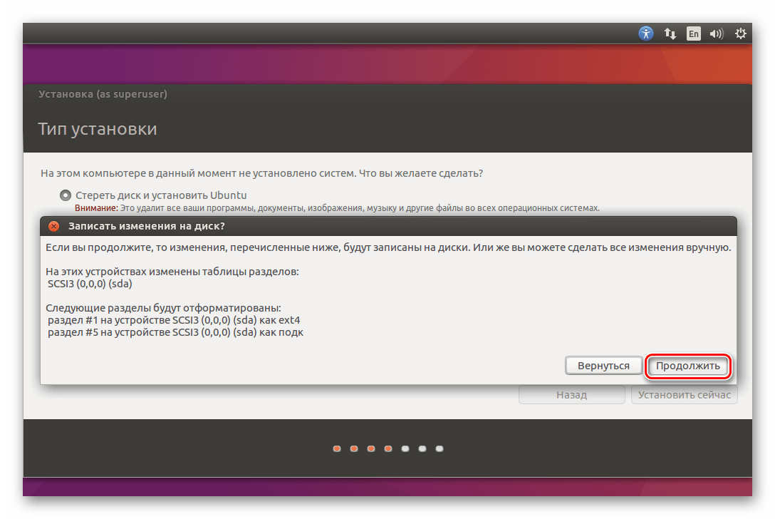 Установщик Linux предостерегает вас от ошибочных действий. Ознакомьтесь с представленной вам информацией и смело жмите «Продолжить».