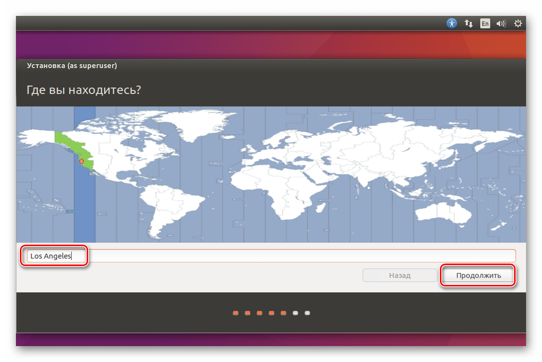 Укажите ваше место пребывания и нажмите «Продолжить». Таким образом установщик определит, в каком часовом поясе вы находитесь и сможет правильно настроить время.