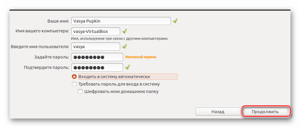 Заполните все поля, что видите на экране. Выберите, хотите ли вы вводить пароль при входе, или же вход будет осуществляться автоматически. Нажмите кнопку «Продолжить».