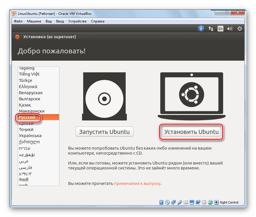 Выберите язык из списка в левой части окна. Нажмите «Установить Ubuntu».