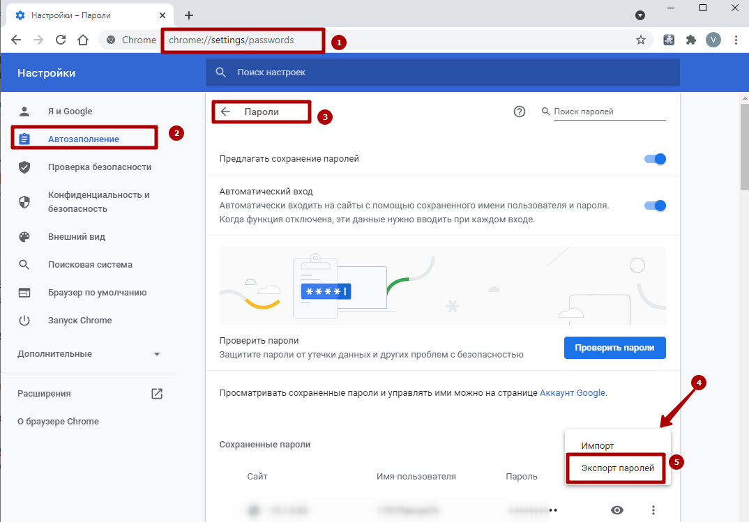 Похожим образом Вы можете экспортировать данные для входа на часто посещаемые сайты. Для этого войдите в настройки Chrome, в поле «Автозаполнение» выберите «Пароли».