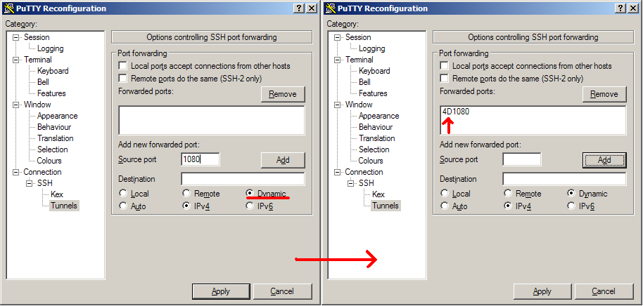 Чтобы заставить PuTTY исполнять роль socks–прокси, нужно параметры SSH–сессии с 192.168.0.2 на 192.168.0.3 изменить следующим образом:
