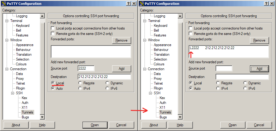 и указываем, что локальный порт 2222 нашего компьютера должен быть поставлен в соответствие порту 22 на сервере с IP–адресом 212.212.212.212. Далее жмём кнопку «Open», авторизуемся на сервере 192.168.0.3. Затем создаём ещё одно подключение (далее по тексту SSH–сессия 2), но уже на localhost, порт 2222 и жмём кнопку «Open»: