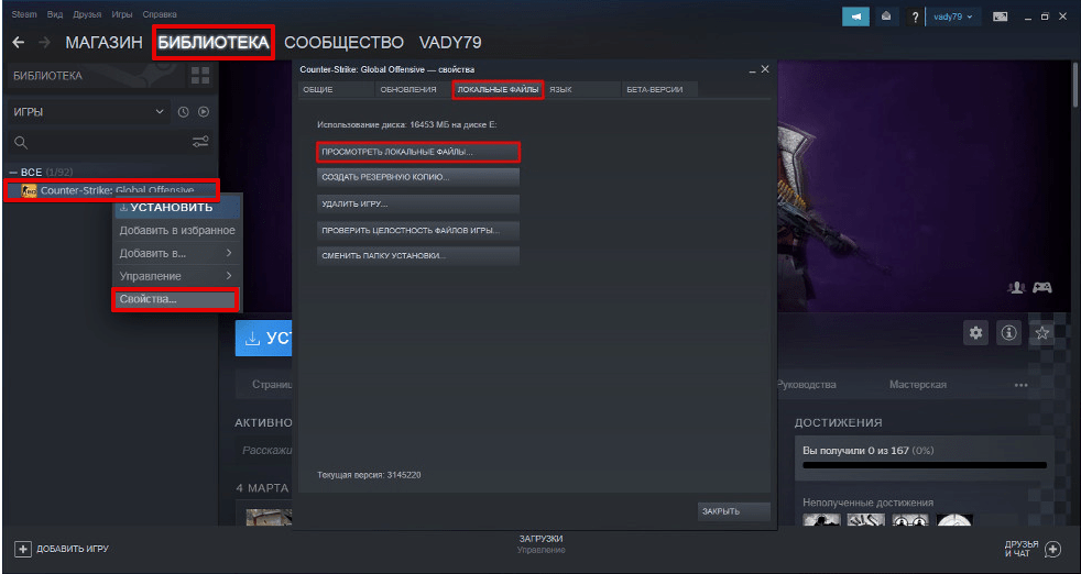 Автоматический режим. Запускаете приложение Steam и переходите по вкладке «Библиотека». Из списка игр правой кнопкой мыши отмечаете CS:GO и выбираете «Свойства». В новом окне переходите в меню «Локальные файлы» и «Просмотреть локальные файлы». После загрузки открываете папку csgo, выбираете файл с расширением .cfg и меняете его на ранее скачанный конфиг.