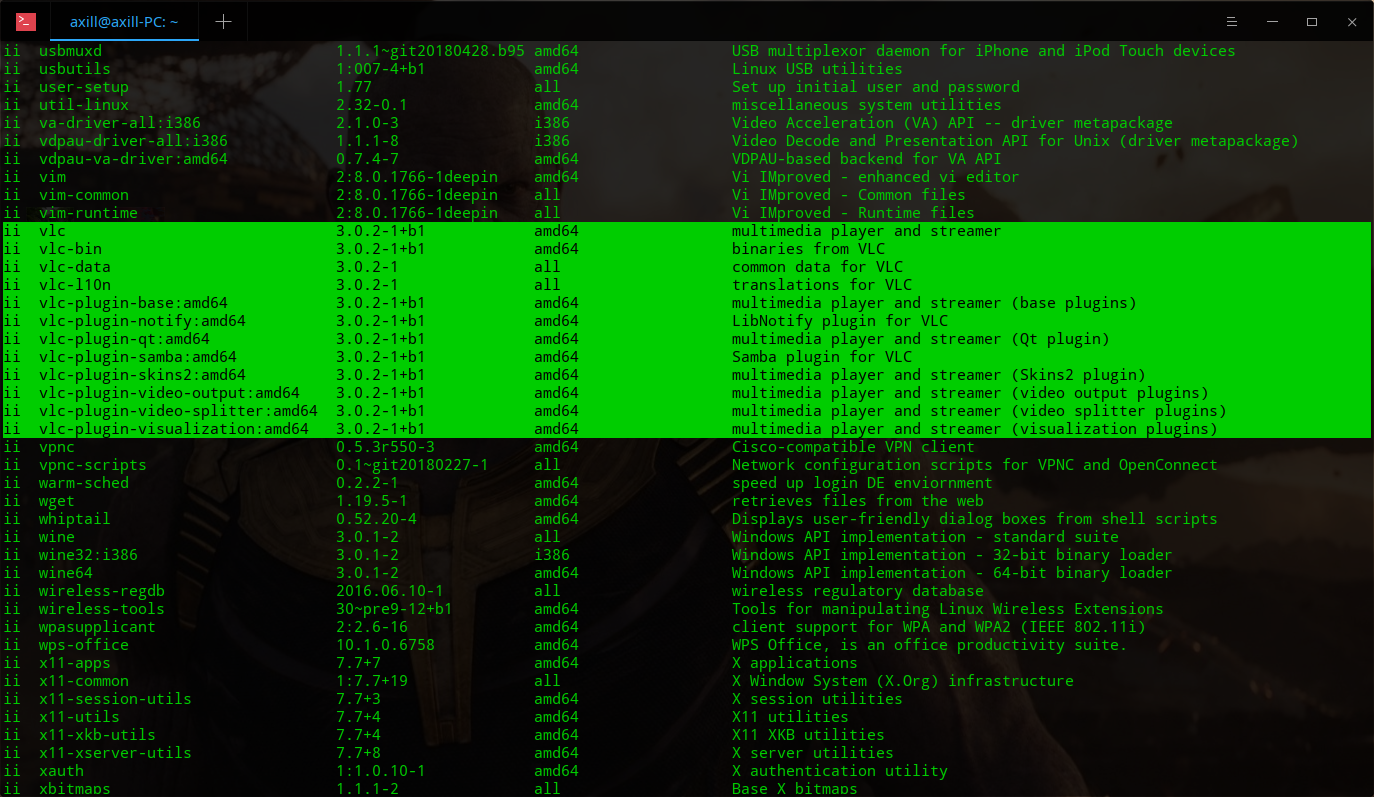 Вы должны увидеть довольно длинный список имен пакетов вместе с номером версии и небольшим описанием, как показано на скриншоте выше. Большинство приложений устанавливают несколько пакетов, поэтому важно, чтобы вы могли определить основной пакет приложения. Например, на скриншоте выше вы можете увидеть vlc, vlc-bin, vlc-data и т.д. Если вы хотите удалить их, вы должны удалить vlc, потому что это, очевидно, основной пакет