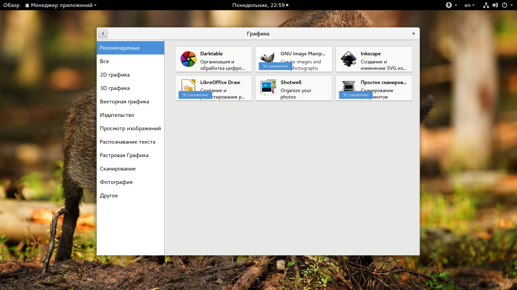 Список всех установленных пакетов находится на вкладке Установлено, здесь приложения рассортированы по категориям: