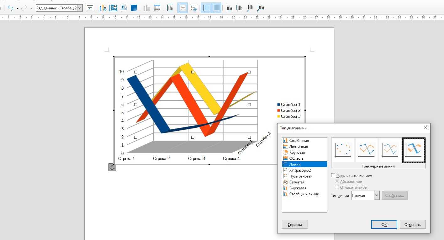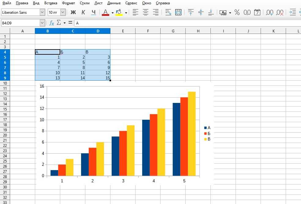 К сожалению, в текстовом редакторе LibreOffice (как и в Word) не предусмотрена возможность создания диаграммы на основе данных из готовой таблицы. Поэтому, если вы хотите создать диаграмму, лучше сначала создать ее, а затем отредактировать значения. Для начала потребуется перейти в раздел «Вставка», затем выбрать одноименный пункт. Диаграмма будет с рандомными значениями – чтобы изменить их, следует нажать на пункт «Таблица данных» в меню. Меняете по необходимости все значения, цветовые схемы, наименования элементов и применяете изменения.