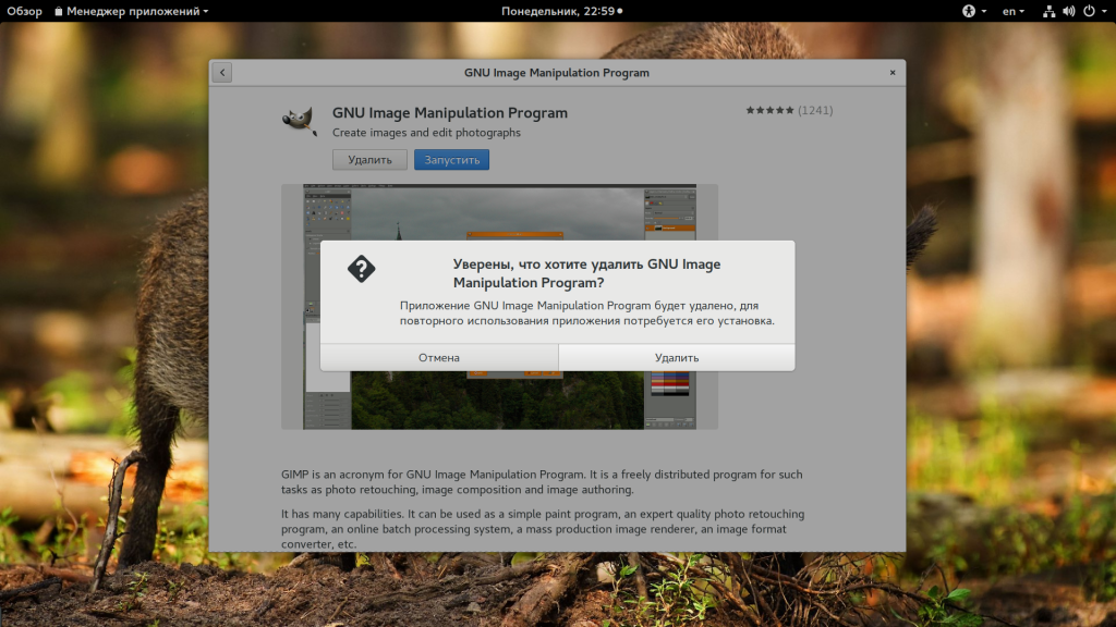 Чтобы удалить пакет Ubuntu, достаточно кликнуть по нему левой кнопкой мыши, и когда появляться доступные действия нажать кнопку Удалить: