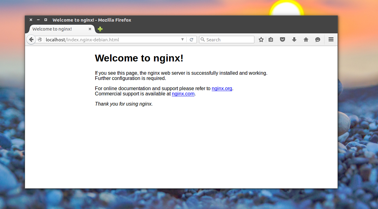 После того, как Nginx будет запущен, он будет доступен по адресу сервера, на который он устанавливался. Вы можете проверить, всё ли работает, просто перейдя по адресу сервера, введя его в браузере. Для примера Nginx был установлен на localhost: