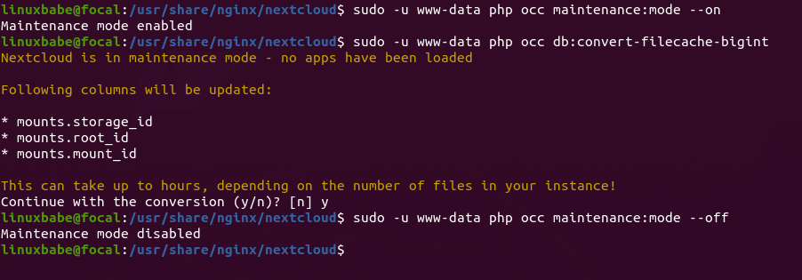 Now if you refresh the NextCloud Settings -> Overview page, the warning about big int should be gone.
