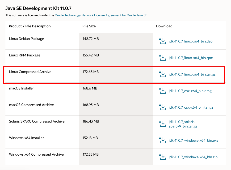 - Прокрутите вниз до раздела загрузки Java SE 11 (LTS) .