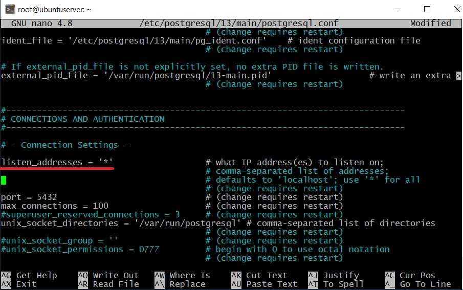 По умолчанию PostgreSQL прослушивает только адрес localhost, поэтому, для того чтобы мы могли подключаться по сети, нам нужно указать, какие сетевые интерфейсы будет просушивать PostgreSQL. Я для примера укажу, что прослушивать нужно все доступные интерфейсы. Если у Вас несколько сетевых интерфейсов, и Вы хотите, чтобы PostgreSQL использовал только один конкретный, то Вы его можете указать именно здесь.