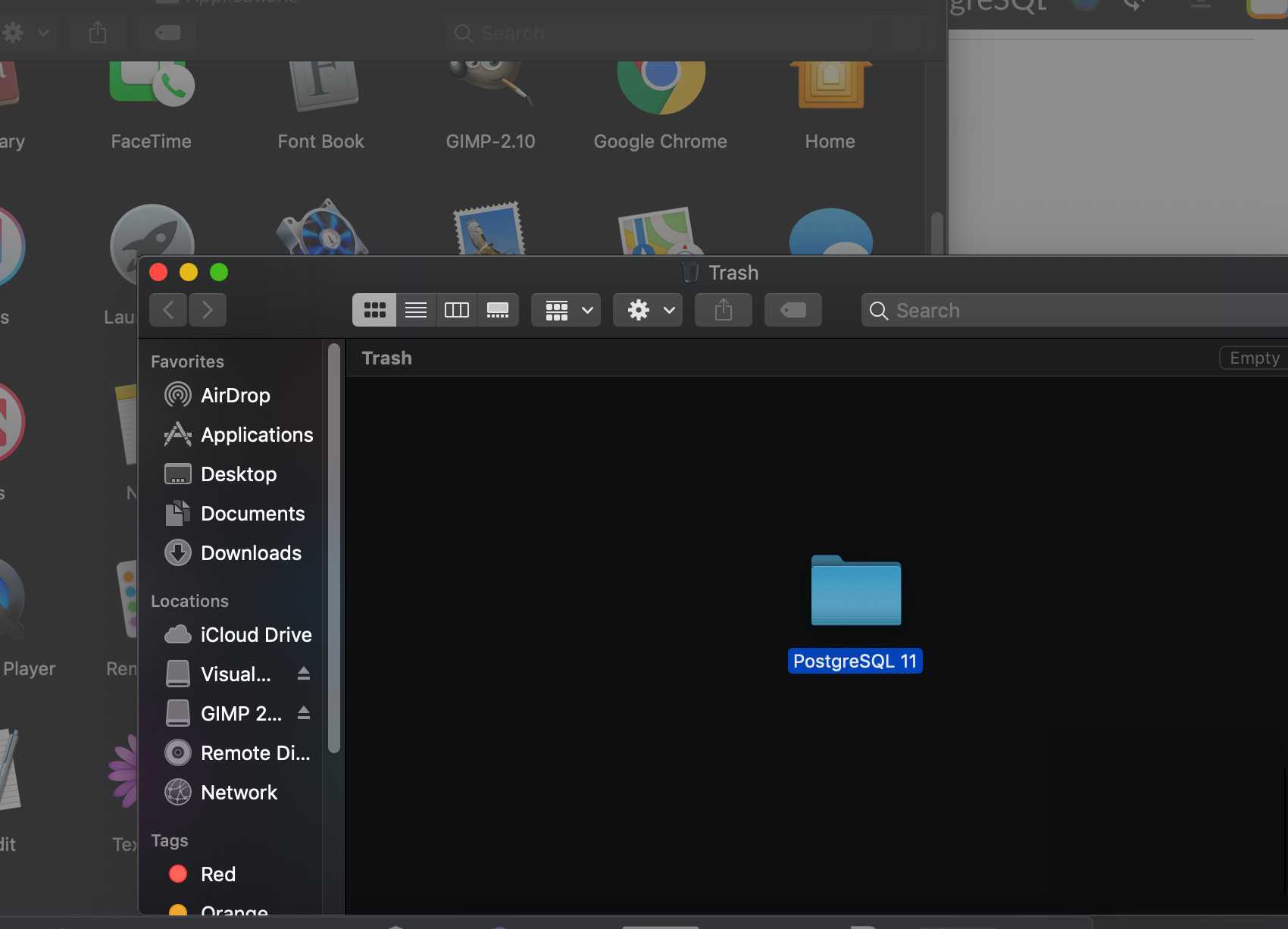 To uninstall PostgreSQL on macOS, open a new instance of Finder and navigate to the Applications directory. Look for the PostgreSQL folder and drag its contents to the Trash application folder in macOS.