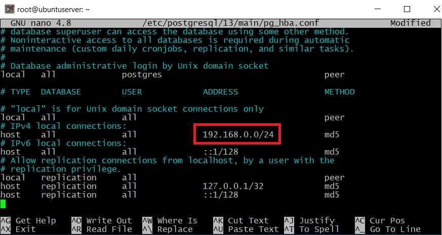 Теперь давайте разрешим подключение из сети, я для примера разрешу подключаться из сети 192.168.0.0/24 с методом аутентификации md5.