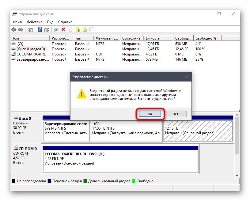 Как только вы нажмете кнопку «Удалить том», появится сообщение «Выбранный раздел не был создан Windows и может содержать данные, распознаваемые другими операционными системами. Вы хотите удалить этот раздел? » Выберите «Да», чтобы удалить раздел Ubuntu.