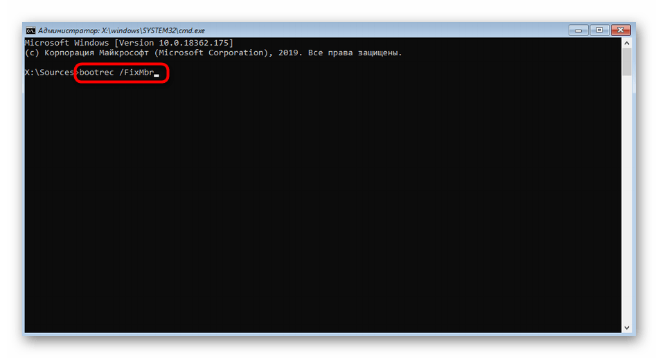 - Когда появится сообщение об успешном проведении операции, ввести в строку надпись «bootrec /FixBoot».