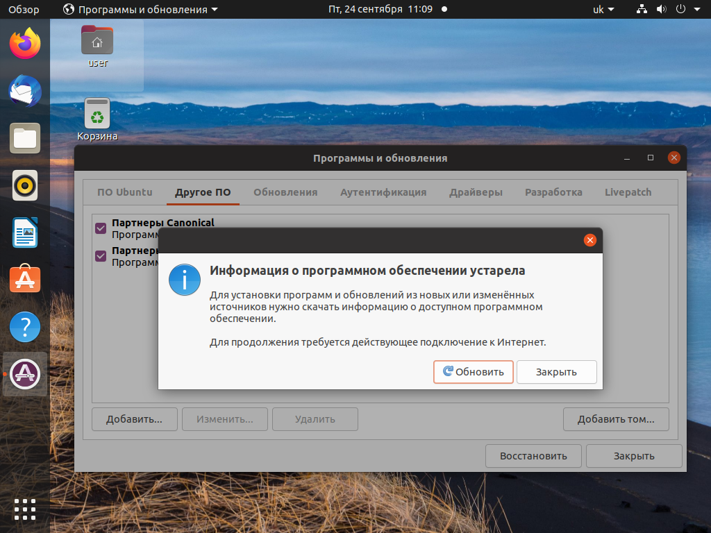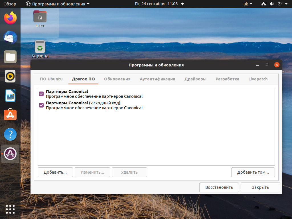 Затем перейдите на вкладку Другое ПО и отметьте пункт Партнёры Canonical и Партнёры Canonical (исходный код), после чего введите пароль.