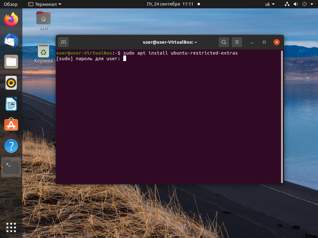 Нажмите Enter, введите пароль, затем согласитесь с требованиями — нажмите Y на клавиатуре. После этого подождите, пока скачаются и установятся все необходимые кодеки Ubuntu.