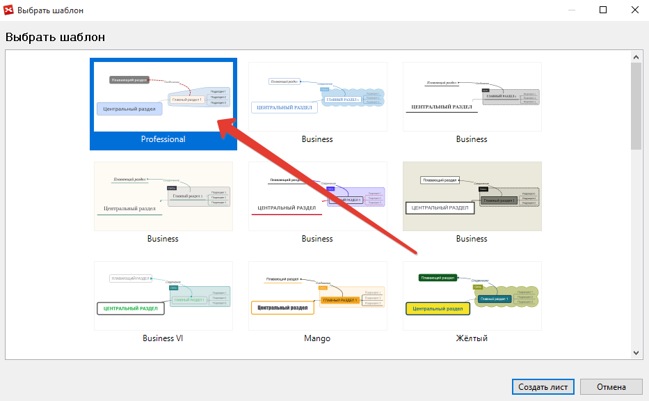 Под цифрой 3 — стандартный шаблон для интеллект-карт, на примере которого Вы узнаете базовый функционал программы.