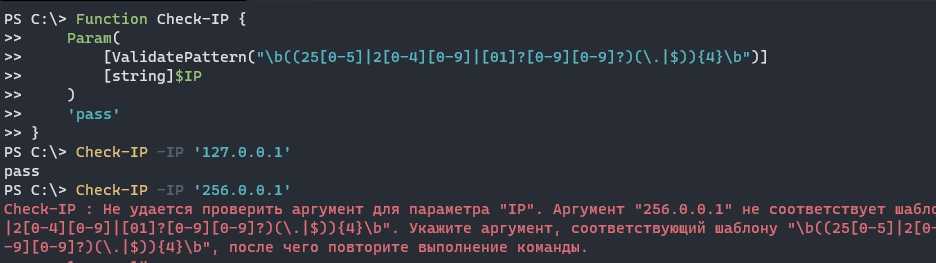 Мы можем привязать к параметру проверку на простые регулярные выражения (SupportsWildcards) и расширенные (ValidatePattern). Так мы убедимся, что в параметр передают валидный IP адрес: