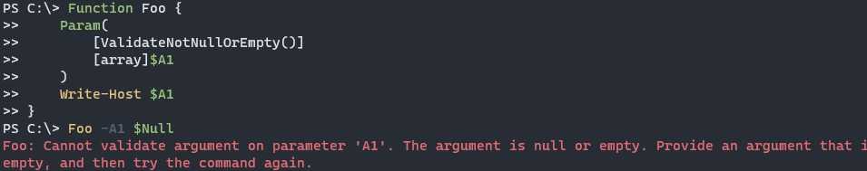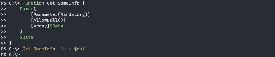 У параметров, которые не помечены ‘Mandatory’, возникнет противоположная проблема. Они пропускают $null без ошибок: