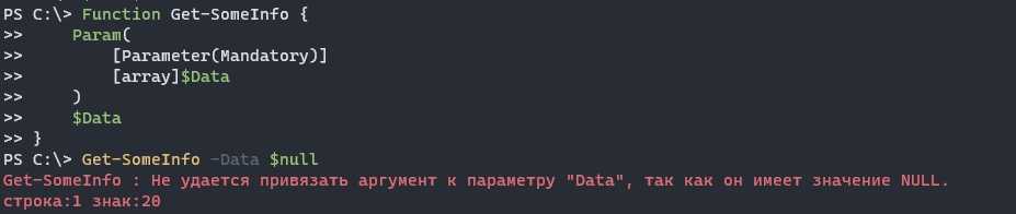 - — позволяет использовать $null у параметров с другим типом данных. Если вы объявляете, например, тип параметра », а передаете $null, произойдет ошибка. Этот параметр помогает ее избежать у ‘Mandatory’;