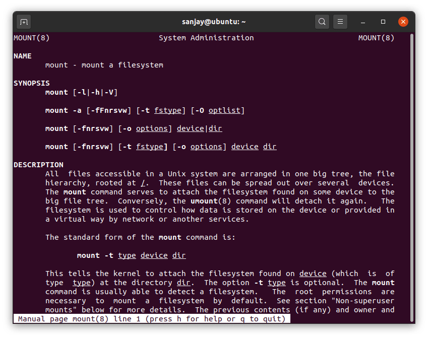 Теперь мы готовы связать USB-устройство с файловой системой Linux и получить доступ к его данным. Чтобы сделать то же самое, мы будем использовать утилиту ‘mount’. Если вы хотите узнать о «mount», прочитайте его руководство, используя: